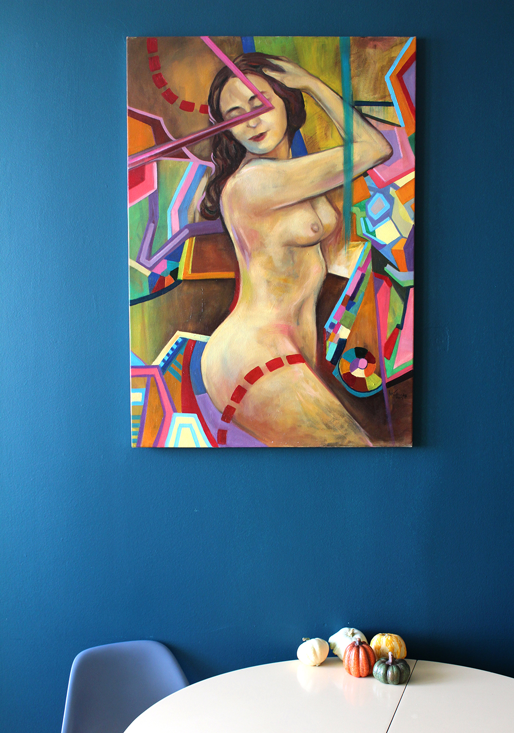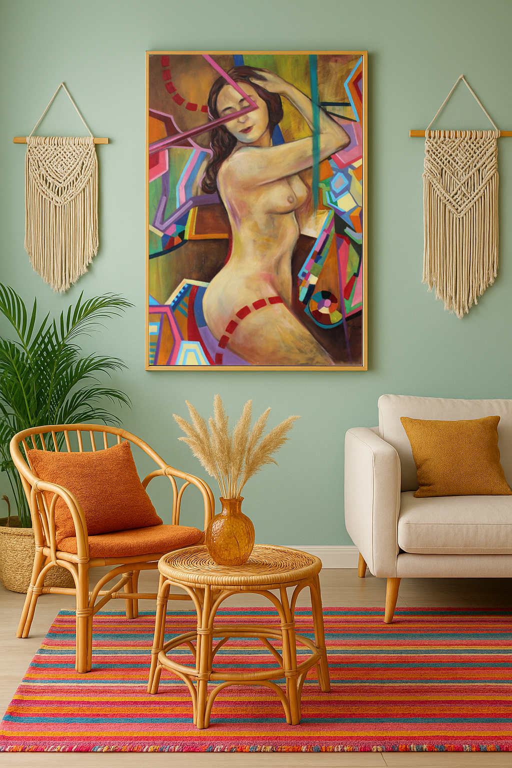Obraz olejny przedstawiający akt kobiecy w dynamicznej, geometrycznej kompozycji. Klasyczne ujęcie ciała ludzkiego zostało zestawione z intensywnymi, abstrakcyjnymi formami i kolorami, które przecinają postać, wprowadzając kontrast i głębię. Praca łączy w sobie elementy figuratywne z nowoczesną estetyką, tworząc wyrazistą, nieoczywistą całość. Idealny do wnętrz, w których sztuka ma grać pierwszoplanową rolę.