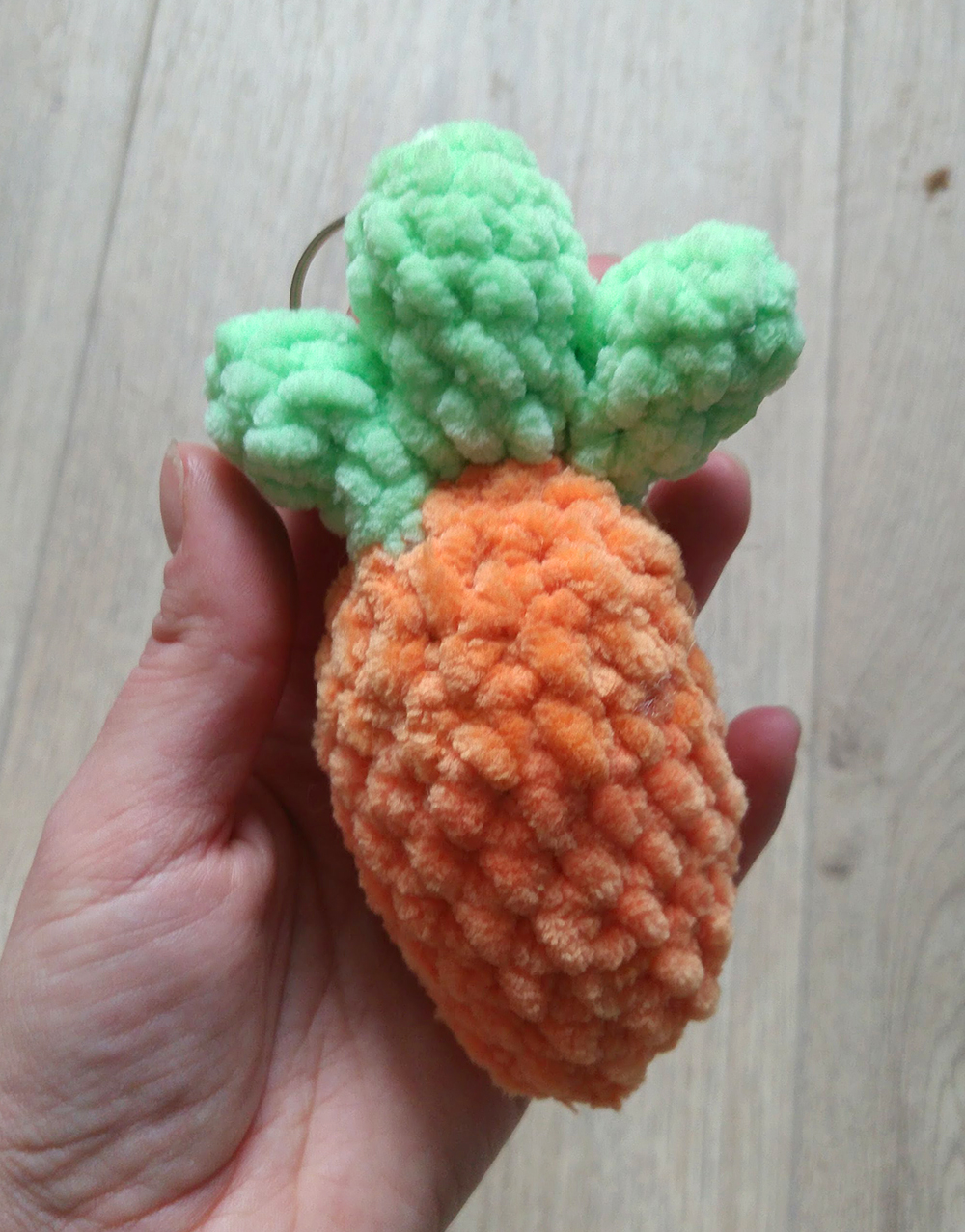 Wykonana ręcznie w Polsce z wyjątkowo miękkiej, pluszowej włóczki, zachwyca pięknym, nasyconym pomarańczem i puchatą zieloną natką. Jest lekka, mięciutka, trwała i tak urocza, że poprawia nastrój szybciej niż chrupnięcie prawdziwej marchewki.