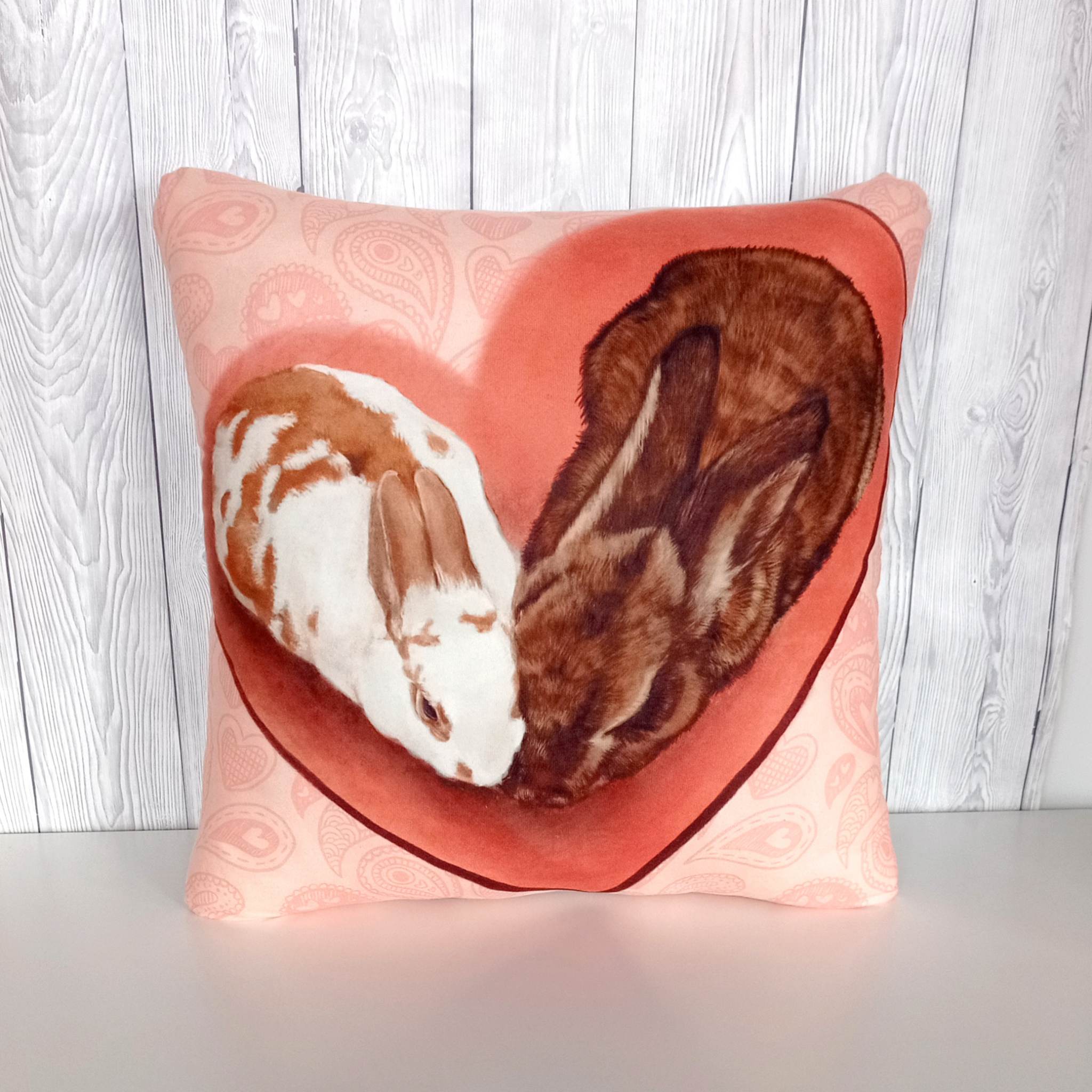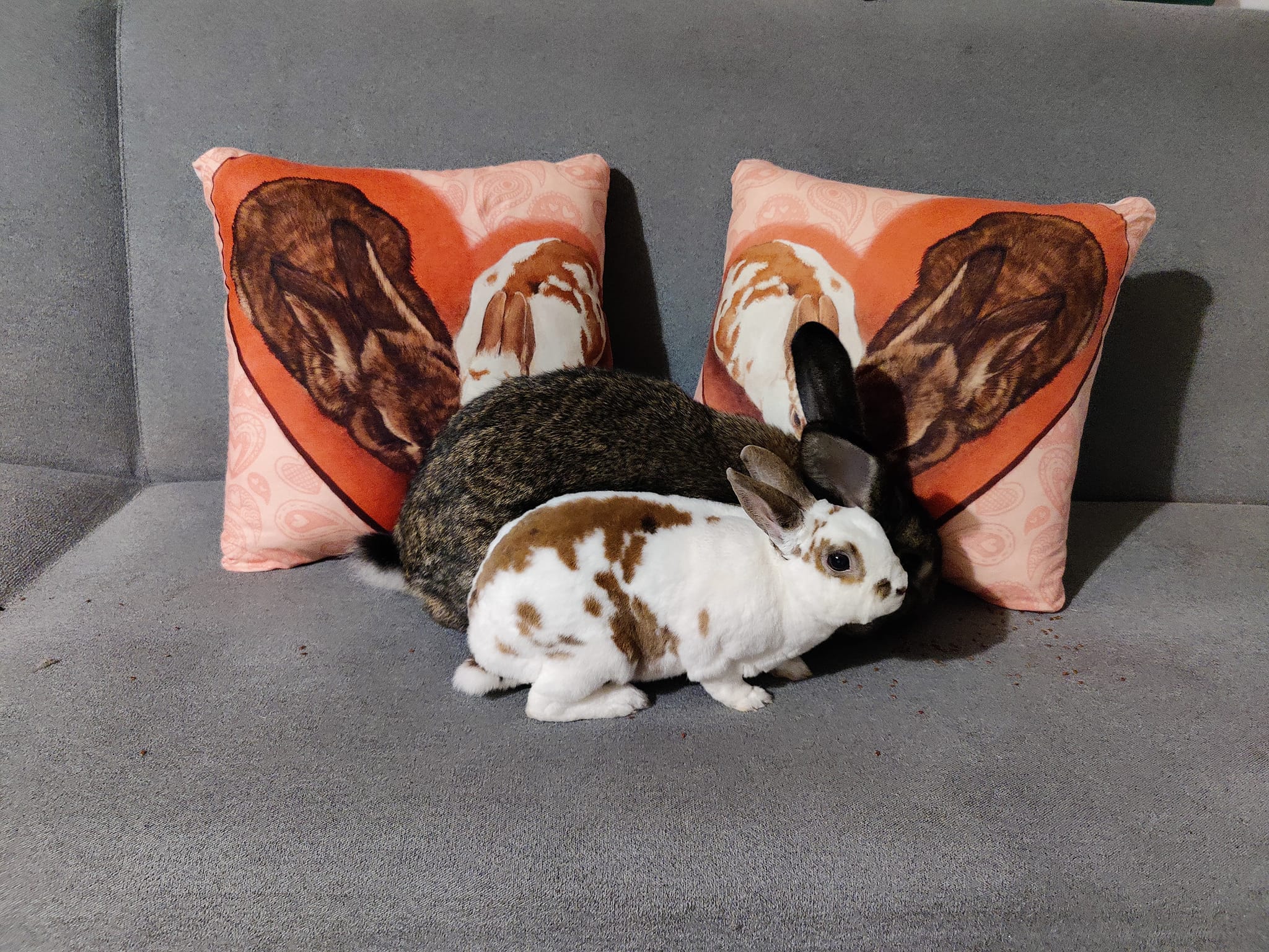 Te dwa króliki wiedzą, jak rozgrzać serce – dosłownie i w przenośni! Zatopione w serduszkowym tle, tworzą duet idealny: trochę czułości, trochę futra i dużo uroku. Ta poduszka z autorską grafiką to must-have dla romantyków i miłośników uszatych przytulanek.