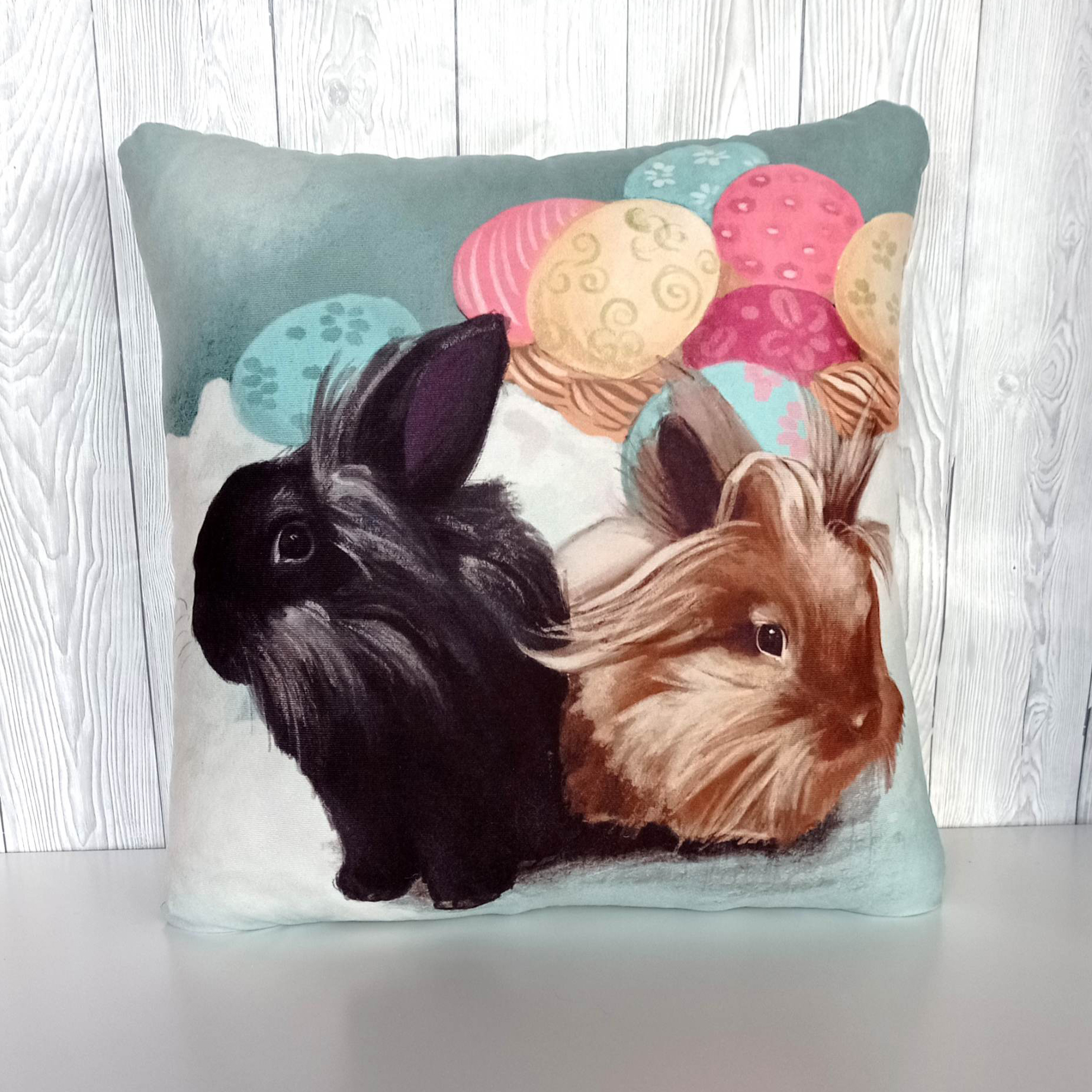 Miękka, puszysta i trwała – ozdobiona autorską ilustracją dwóch słodkich króliczków w otoczeniu kolorowych pisanek. Idealna jako świąteczna dekoracja do salonu, sypialni czy pokoju dziecięcego.