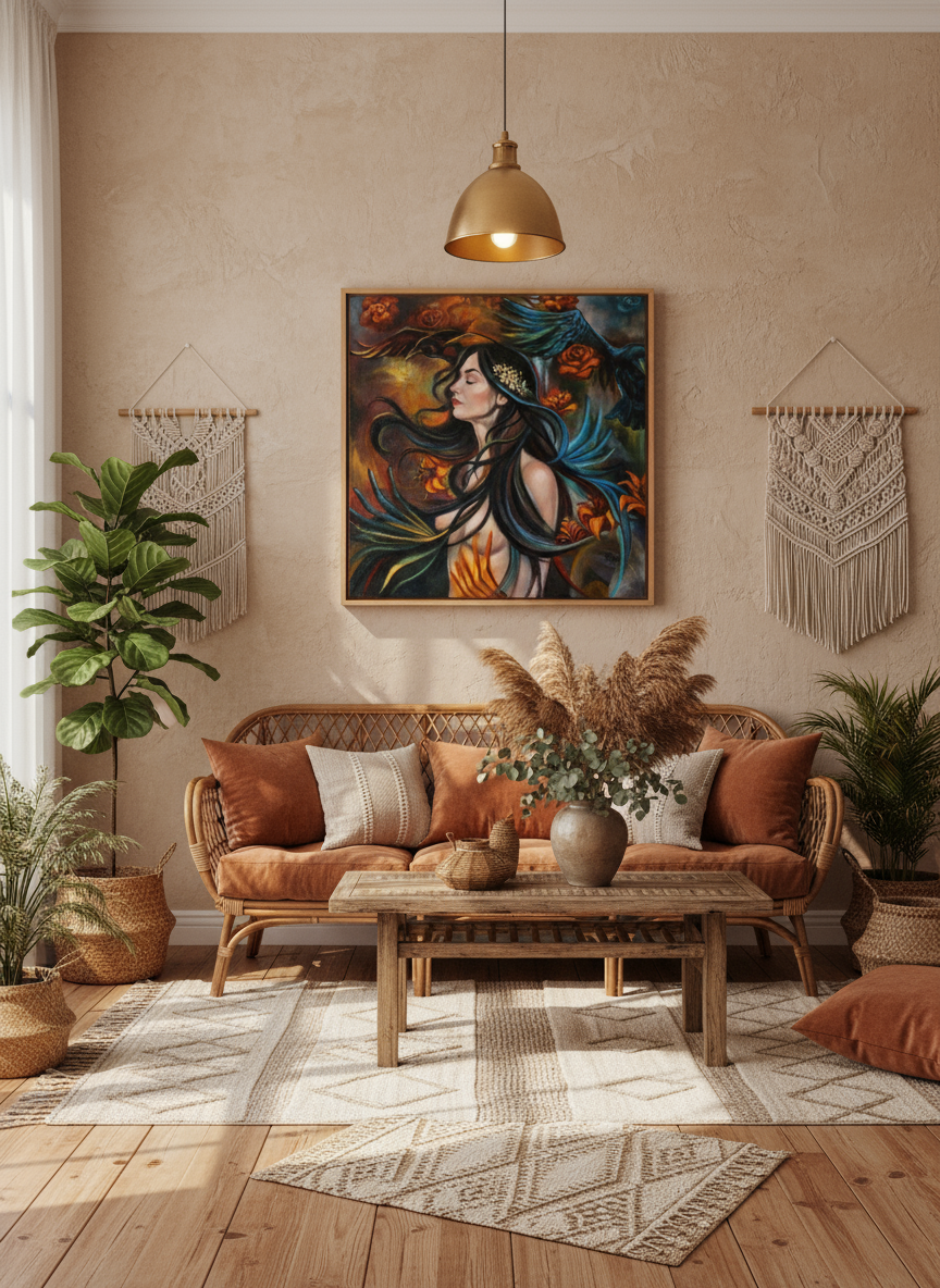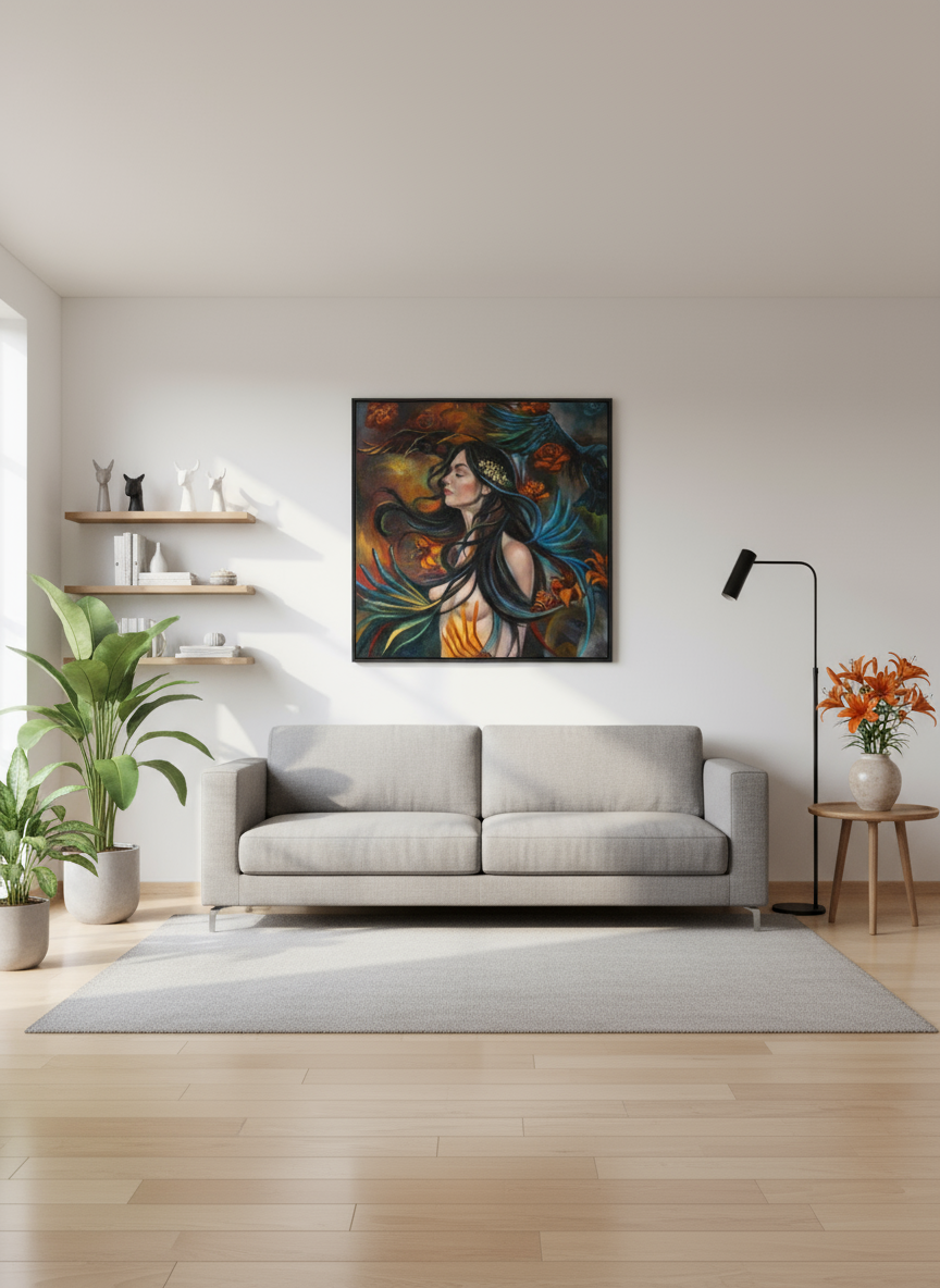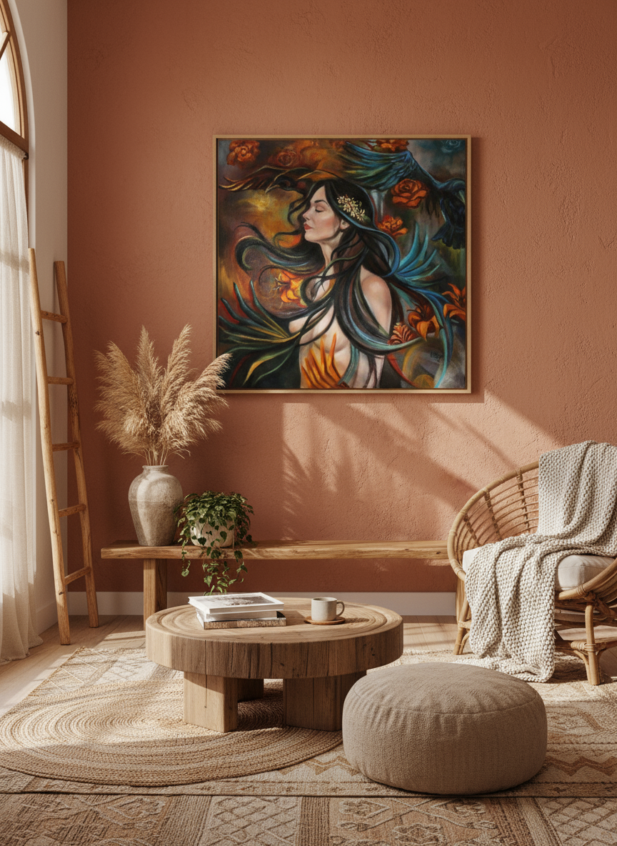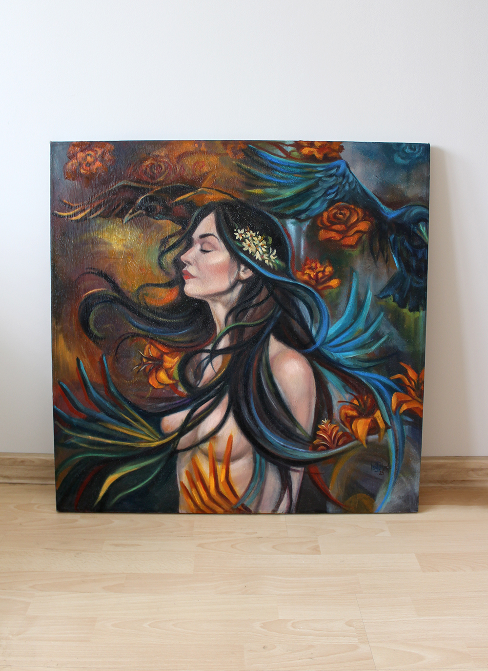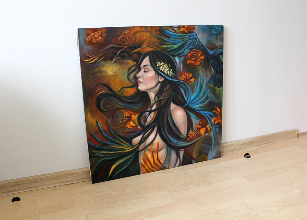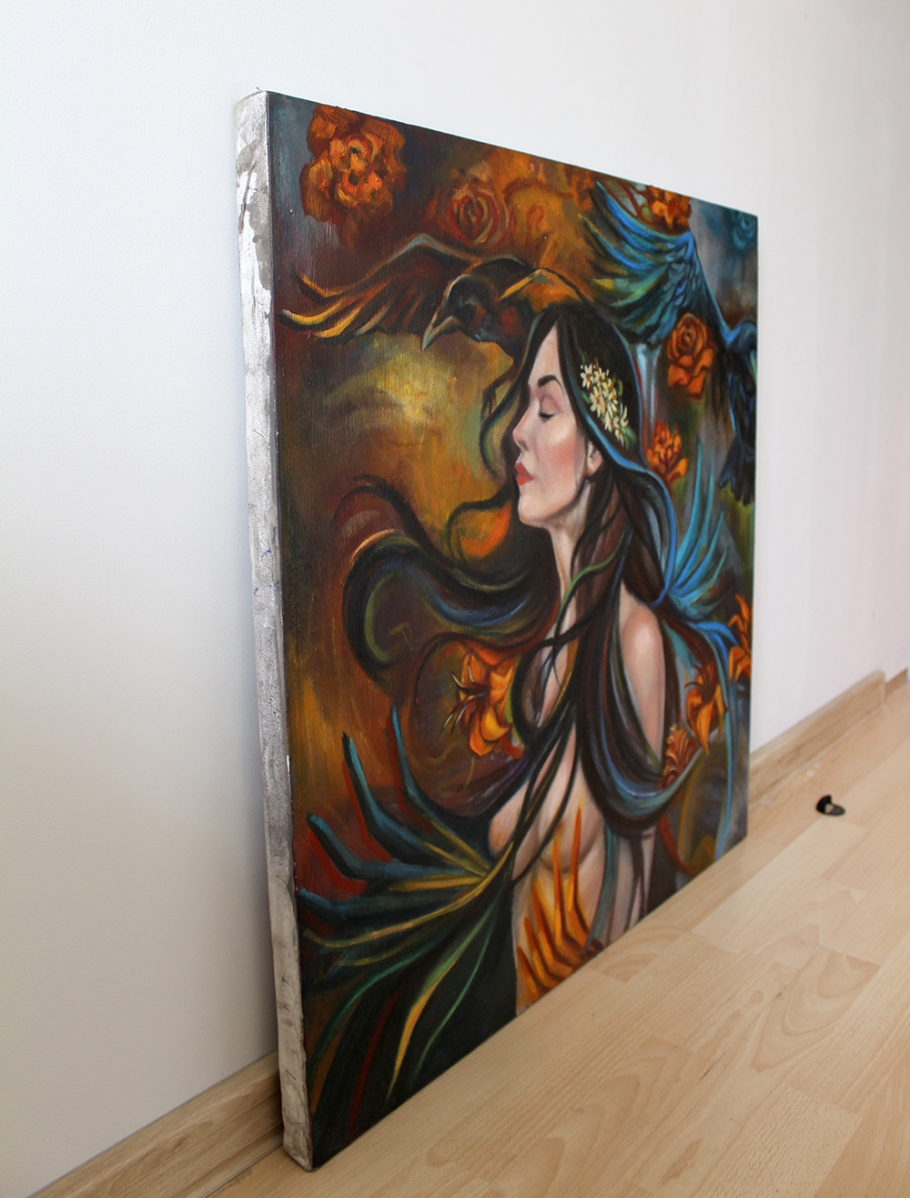 Oryginalny obraz olejny przedstawiający tajemniczą kobietę o ciemnych włosach, otoczoną ptakami, kwiatami i symbolicznymi motywami natury. Kompozycja łączy w sobie realizm i nutę fantazji, tworząc atmosferę pełną poezji, wolności i wewnętrznej siły.